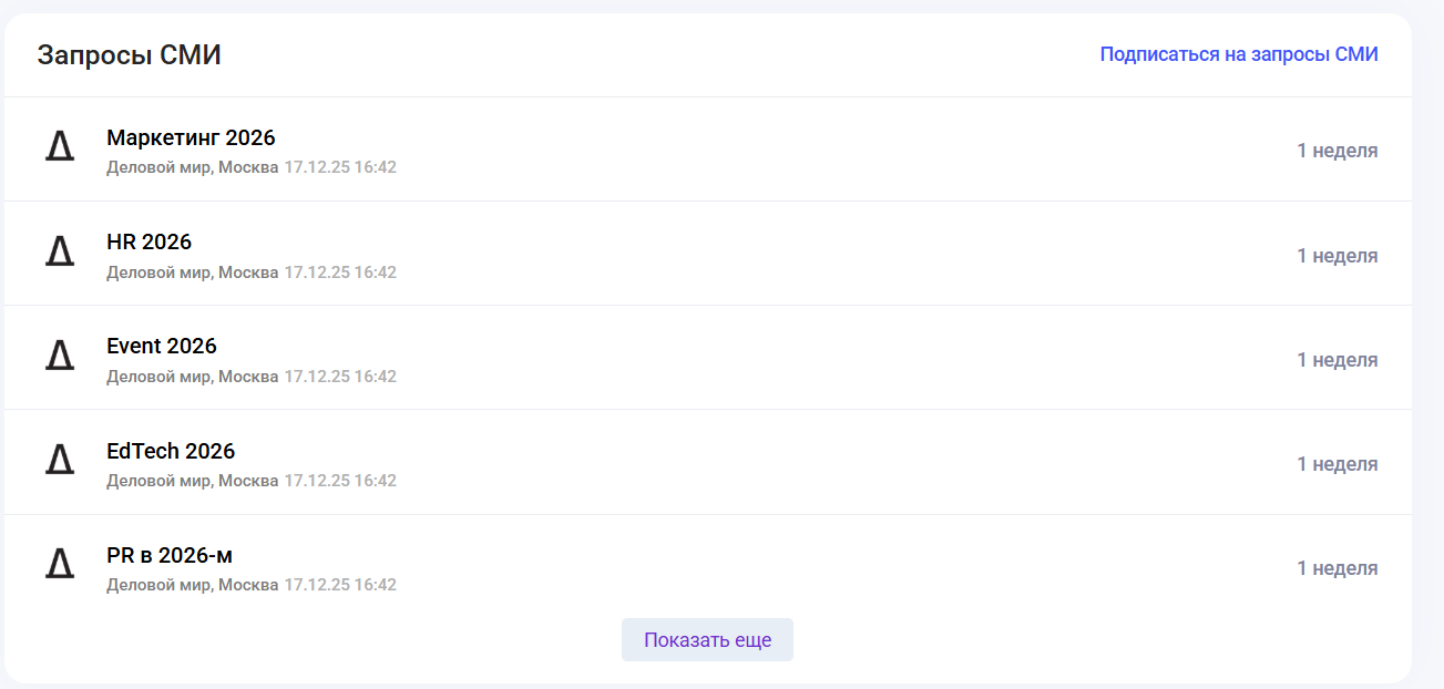 Если вы сомневаетесь, какую тему предложить, можно заранее посмотреть, какие запросы от этого медиа появляются у журналистов. Например, в базе запросов Pressfeed есть список активных тем для Делового мира, там обычно указаны требования к материалу и формат комментариев, что помогает выбрать релевантную тему или подготовить ответ экспертно и в нужном ключе.