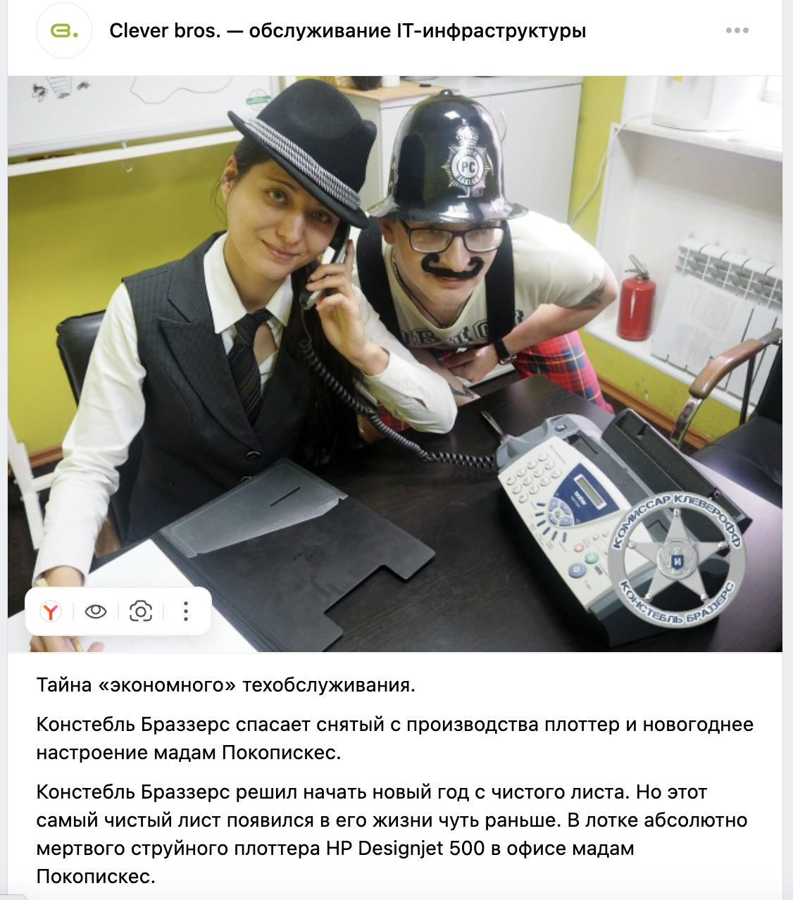 Для проекта с ресайклом картриджей мы вместо скучных кейсов сделали серию игровых историй, где комиссар и констебль расследуют «преступления» бизнеса. Истории выходили в рассылках и соцсетях.