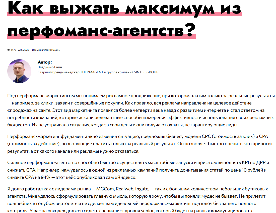 Рассказываем, как бренд THERMAGENT (производство Sintec Group) с помощью услуги «Виртуальный пиарщик» за 4 месяца выстроил репутацию экспертов в маркетинге и управлении продажами, получил охваты в деловых СМИ и закрепился в ТОП-10 поисковой выдачи.