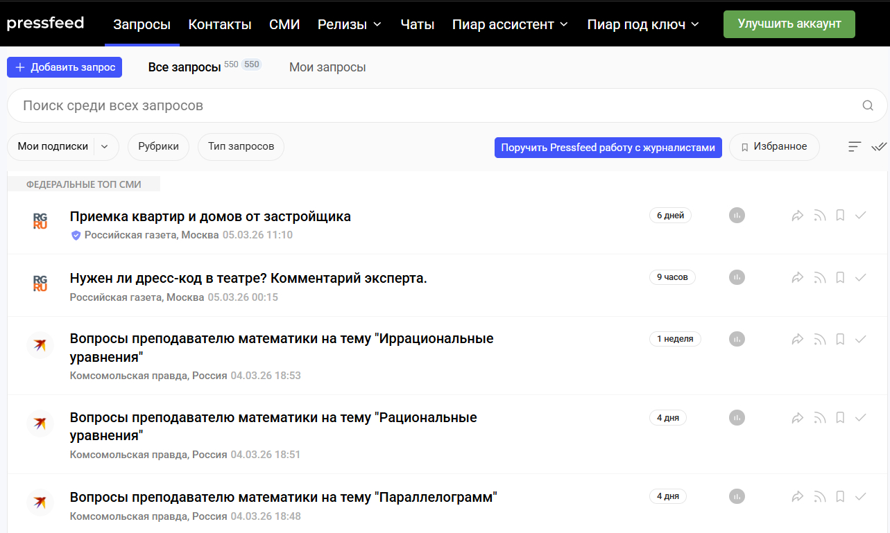 Но как попасть в медиа без бюджета на пиарщиков? Журналисты постоянно ищут живой опыт и мнения практиков. Найти друг друга помогает сервис Pressfeed, где собрано более 15 000 авторов от отраслевых изданий до медиа-гигантов. Вы просто выбираете подходящий запрос по своей теме и отправляете комментарий. Если ваша история или совет подходят, вы становитесь героем материала. Сервис дает три бесплатных питча в месяц, чего вполне хватает для первых публикаций.