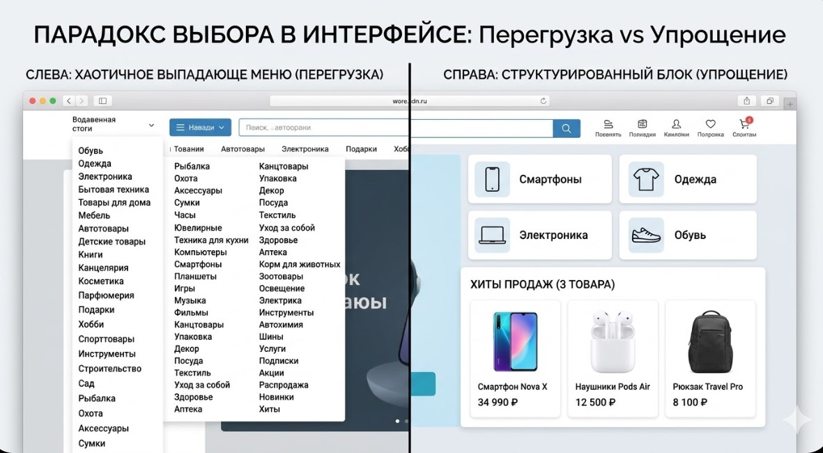 Олеся Богадевич, интернет-маркетолог: «Парадокс выбора действительно существует, но не во всех нишах он работает одинаково. В интернет магазинах одежды, косметики или мебели люди как раз ждут, что смогут сравнить несколько вариантов. Если выбор слишком маленький, возникает ощущение, что смотреть особенно нечего. Поэтому правильная стратегия не урезать ассортимент, а помочь человеку сориентироваться. Фильтры, подборки и рекомендации решают эту задачу гораздо лучше»