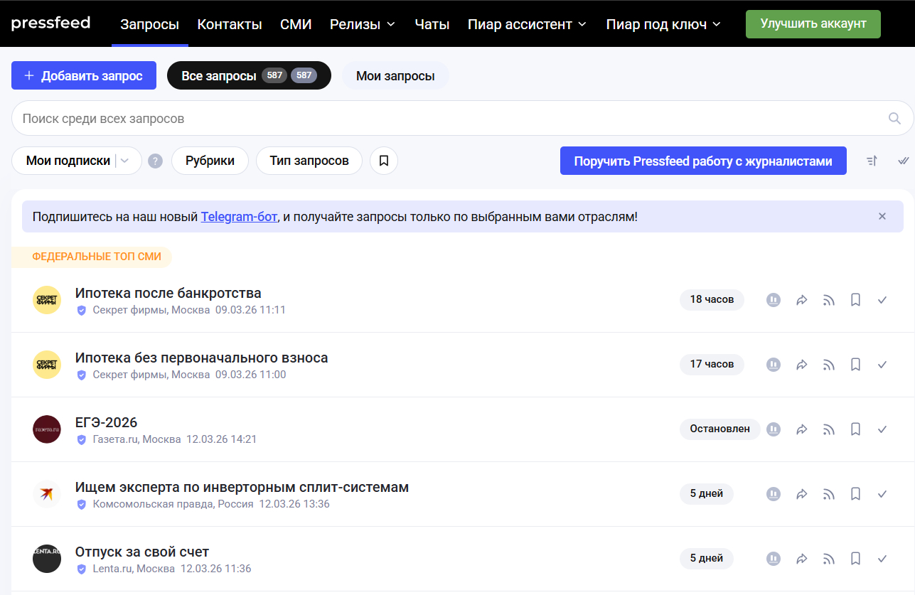 Почему мы решили разобраться в этой теме? Мы в Pressfeed каждый день соединяем бизнес и медиа. На нашей платформе более 15 000 авторов из 6 000 изданий — от федеральных гигантов уровня РБК и «Ведомостей» до нишевых журналов — ищут фактуру для своих материалов. Мы помогаем предпринимателям получать бесплатные охваты в СМИ, просто делясь своей экспертизой.