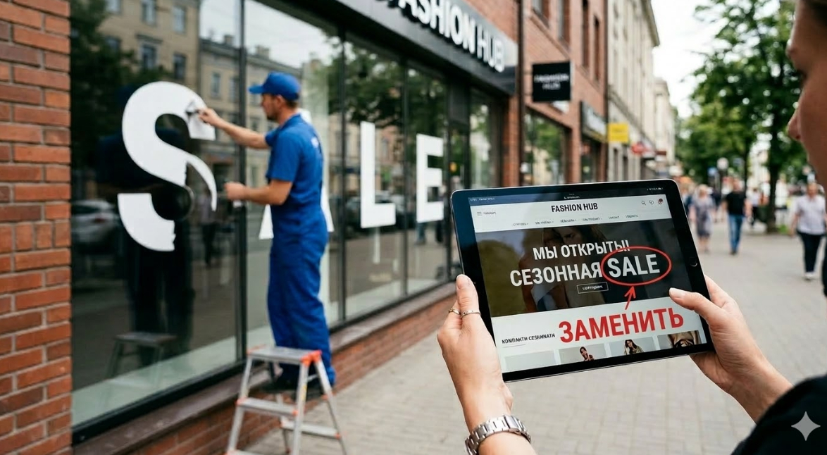 В офлайне всё максимально строго. Закон чётко регулирует все физические носители информации. Вывески, указатели в общественных местах, информационные стенды в торговых центрах, листовки от промоутеров, ценники на полках — всё это нужно срочно привести в порядок. Вы больше не можете просто написать «Sale» на витрине магазина. Нужно обязательно добавить слово «Распродажа».