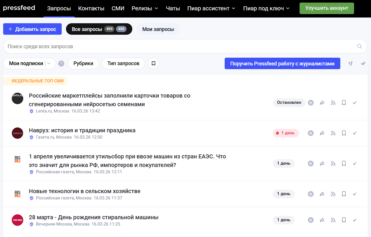 Сервис Pressfeed — это ваш прямой путь в федеральные СМИ и профильные издания. Пока другие тратят бюджеты на баннеры, которые все научились игнорировать, вы можете делиться реальным опытом и забирать лояльность аудитории, которую невозможно купить. Становитесь идейным лидером в своей нише, попадайте в ответы нейросетей и делайте свой бизнес заметным для тех, кто ищет качественные решения.