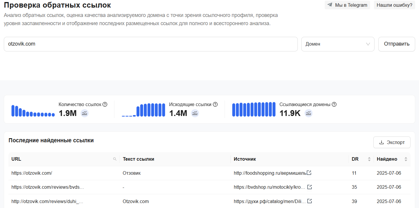Проверить сайт для публикации крауд-ссылок вы можете с помощью сервиса Проверка обратных ссылок. Инструмент оценит качество домена с точки зрения ссылочного профиля, проверит уровень заспамленности и отобразит последние размещенные ссылки.