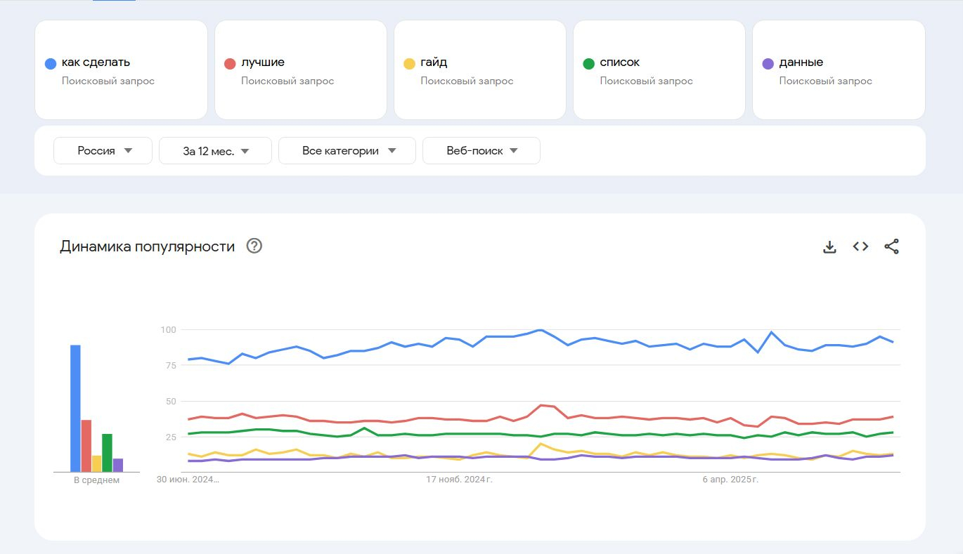 Используйте Google Trends или Яндекс.Wordstat, чтобы найти запросы с стабильным количеством показов и низкой конкуренцией. Примеры запросов для разных ниш: Красота: «Как избавиться от черных точек». Авто: «Как проверить машину перед покупкой». Образование: «Как написать эссе по английскому».