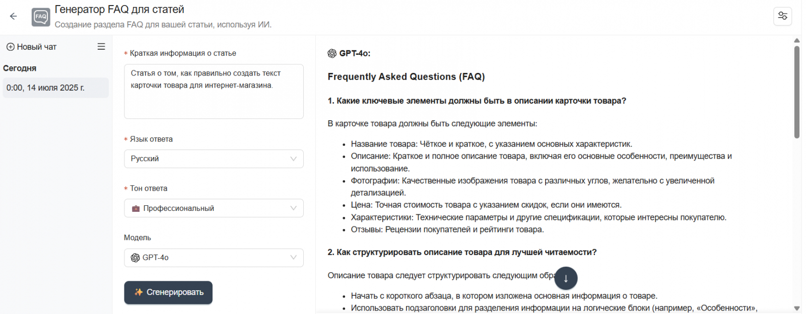 Ключевые мысли лучше размещать в компактных абзацах или оформлять в виде списка. Дополнительно можно включить блок FAQ в конце статьи — он идеально подходит для кратких ответов. Чтобы создать раздел с FAQ с помощью нейросети, воспользуйтесь этим инструментом.