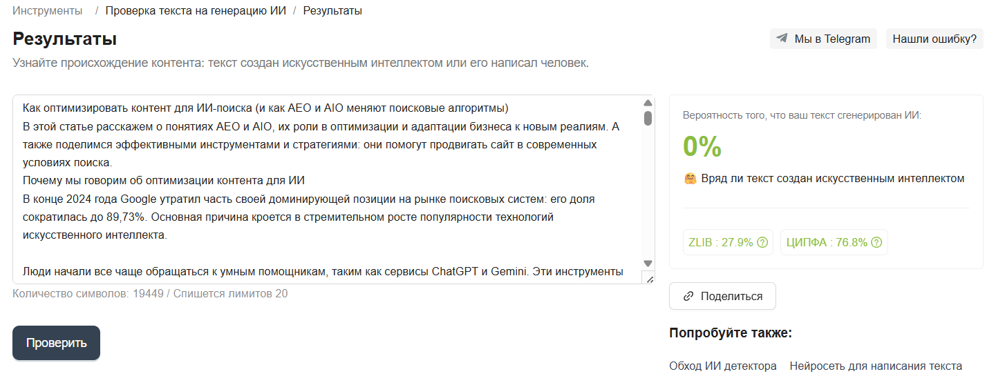 Есть инструменты, помогающие проверить контент на «человечность»: например, сервис Проверка текста на генерацию ИИ.