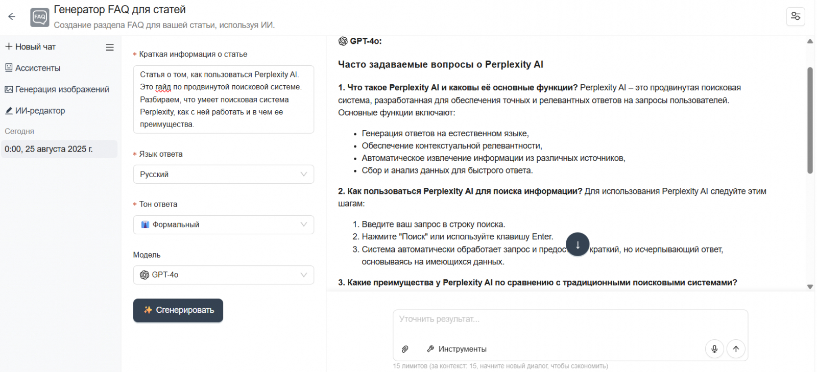 Чтобы создать такой раздел, можно использовать нейросети: например, сервис Генератор FAQ для статей.