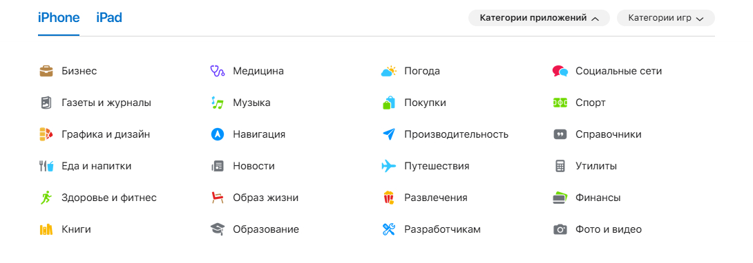 Основная категория должна точно описывать продукт. Это ключ для поиска и рекомендаций. Вторую категорию можно указать, если приложение решает смежные задачи и его ищут в разных разделах.