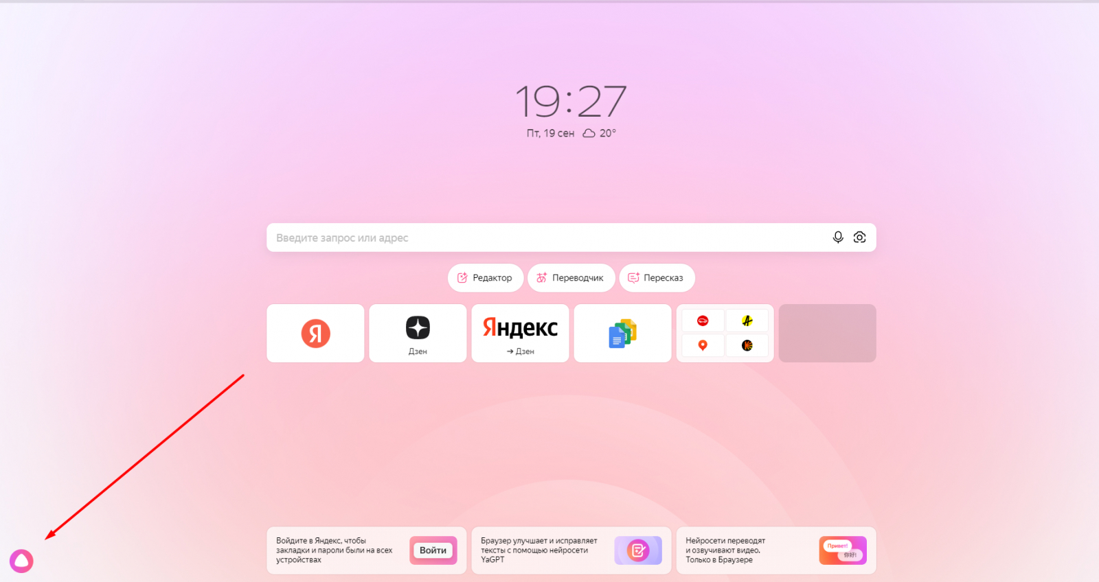 В нижнем углу Яндекс Браузера найдите фиолетовый круглый значок с белым узором — это встроенный доступ к YandexGPT. Нажмите на него, чтобы начать диалог без перехода на другие страницы.