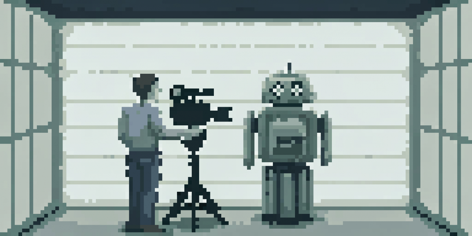 В захламленной мастерской полки ломятся от шестеренок, болтов и пожелтевших чертежей. На деревянной скамье сидит маленький круглый робот — его помятый корпус залатан разноцветными пластинами и покрыт слоями старой краски. Большие светящиеся глаза мерцают бледно‑голубым светом, пока он нервно возится с гудящей лампочкой. В воздухе — тихое механическое жужжание, дождь стучит по окну, а на заднем плане размеренно тикают часы.