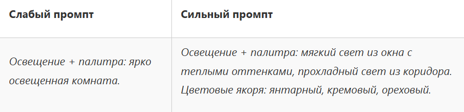 Опишите не только сам свет, но и цветовые акценты, которые его поддерживают. Дайте ИИ 3-5 ключевых цветов: это поможет сохранить единую палитру.