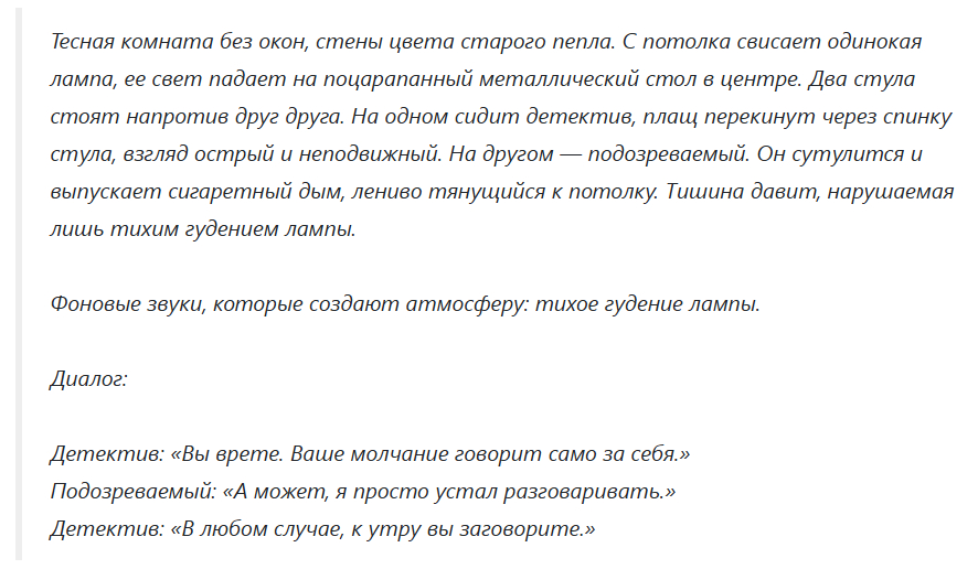 Если в сцене нет диалога, можно задать ритм с помощью одной небольшой звуковой детали: например, «далекий шум машин» или «резкий щелчок». Такие звуки работают как штрих к атмосфере, а не как полноценный саундтрек.