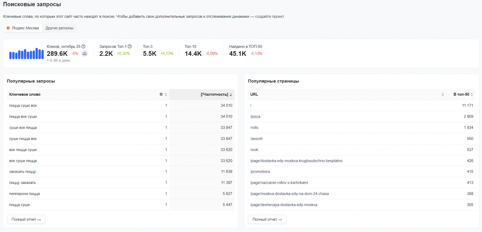 Блок «Популярные страницы» показывает, на какие страницы заходит большинство пользователей. В сфере питания это чаще всего страницы с категориями еды или конкретными товарами, условиями доставки или адресами ресторанов.