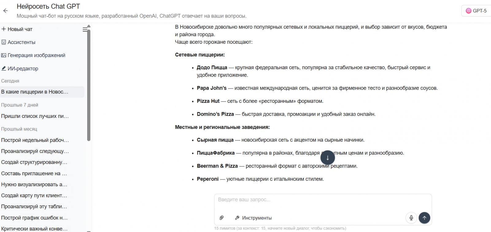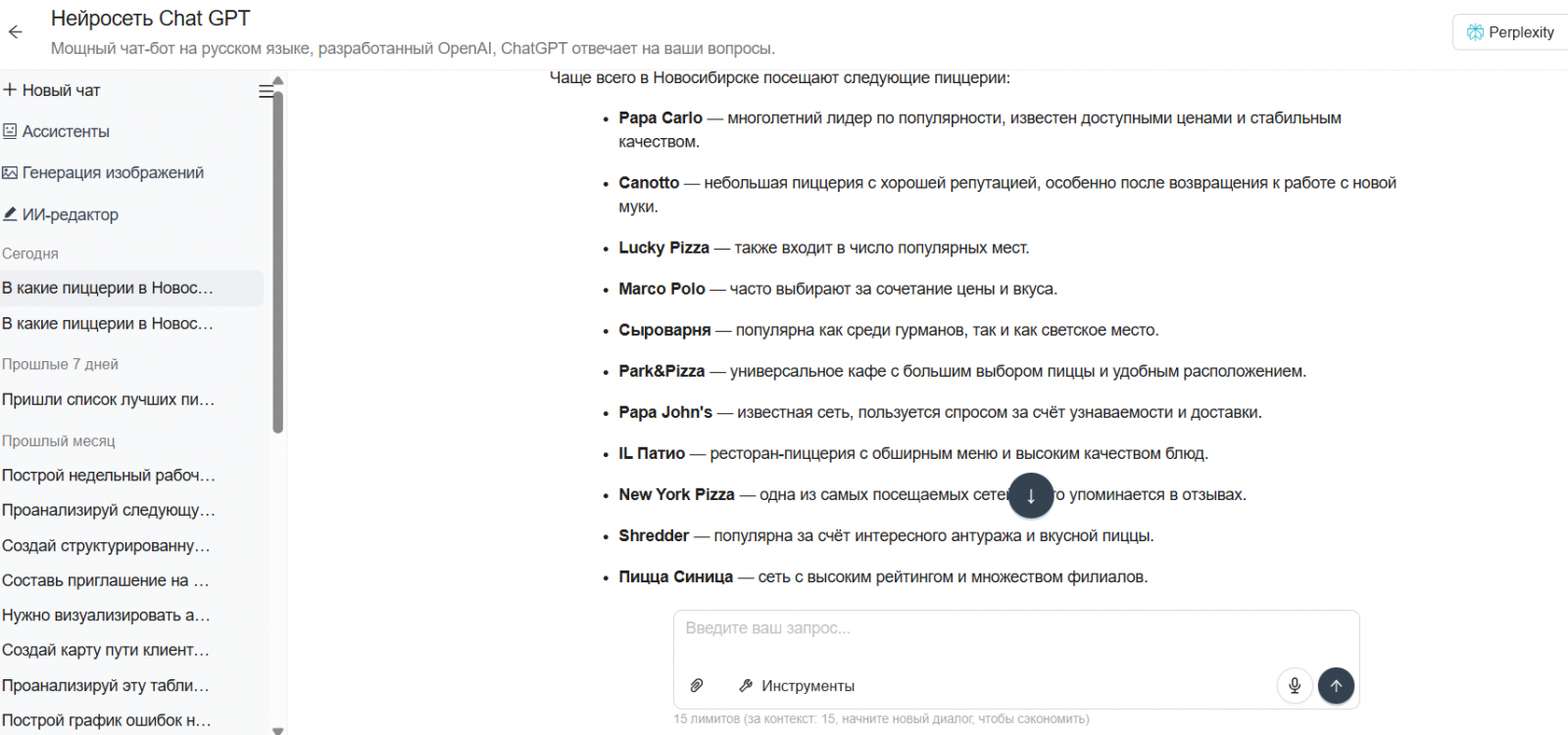 Откройте несколько диалогов с разными моделями нейросети и задайте им разные вопросы о конкурентах из собранного списка. Это могут быть как брендовые запросы, так и общие в духе «в какие пиццерии ходят чаще всего». Ответы ИИ покажут, как велико присутствие бренда в сети, насколько оптимизирован его контент и как высока его узнаваемость при поиске релевантной информации.