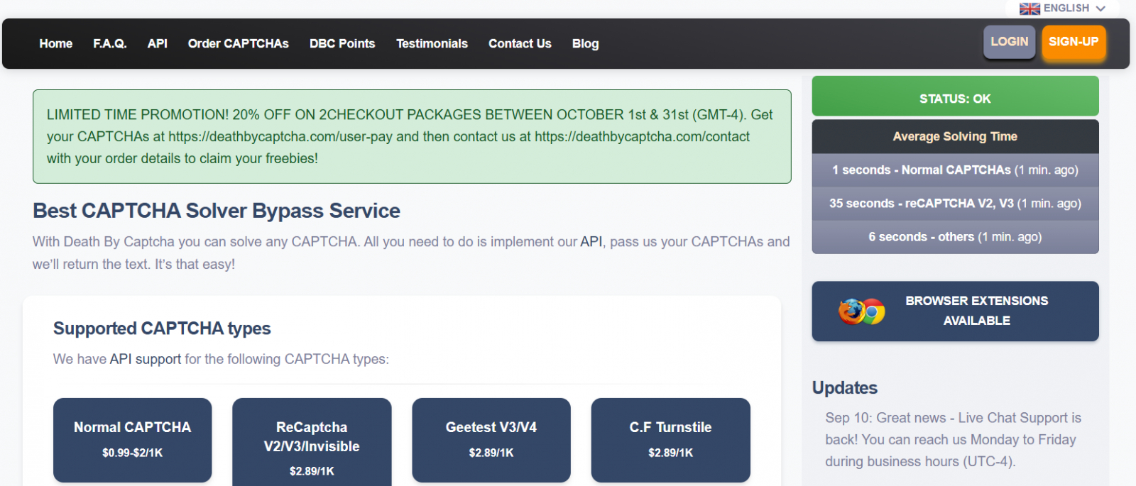 Среднее время распознавания для обычной капчи — 3 секунды. Для самых популярных: reCAPTCHA V2, V3, etc время ожидания составляет уже 43 секунды, что очень много в сравнении с другими сервисами. Среднее время отклика по всем капчам составляет 15 секунд. Скорость AI-режима — 1–2 секунды, но точность ~85%.