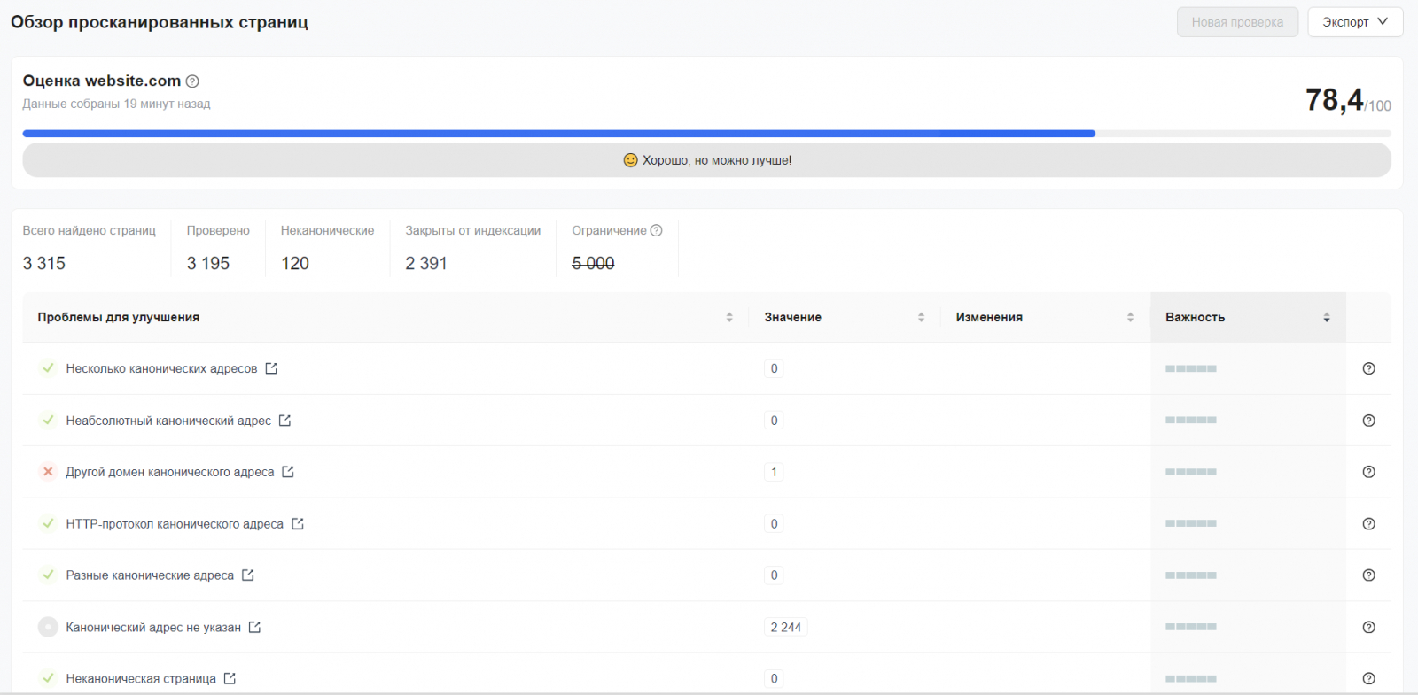 54. Запланируйте регулярный аудит сайта. Проверяйте сайт на возможные ошибки. Периодический аудит помогает отлавливать проблемы до того, как они повлияют на ваши позиции. Сервис «Аудит сайта» показывает технические ошибки ресурса и позволяет отсортировать их по степени важности.
