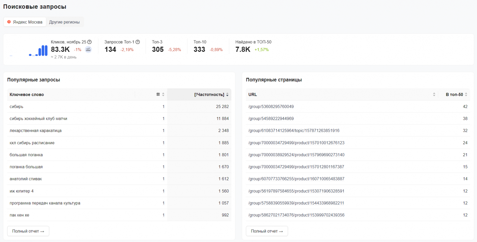 В сервисе «Анализ сайта» можно посмотреть список популярных страниц и главные запросы, по которым на ваш сайт приходит органический трафик.
