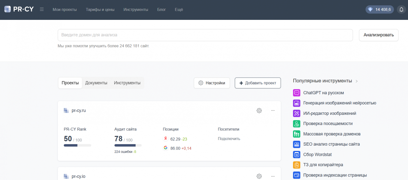 PR-CY — это программная платформа для SEO-мониторинга и продвижения сайтов. Она помогает собирать, хранить и анализировать данные о позициях, ошибках сайта, трафике и спросе.
