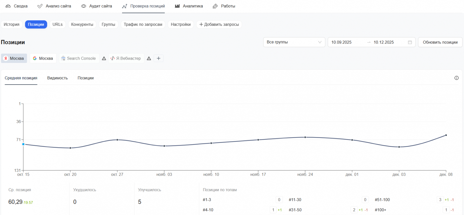 - Мониторинг позиций по ключевым фразам с регулярным обновлением.