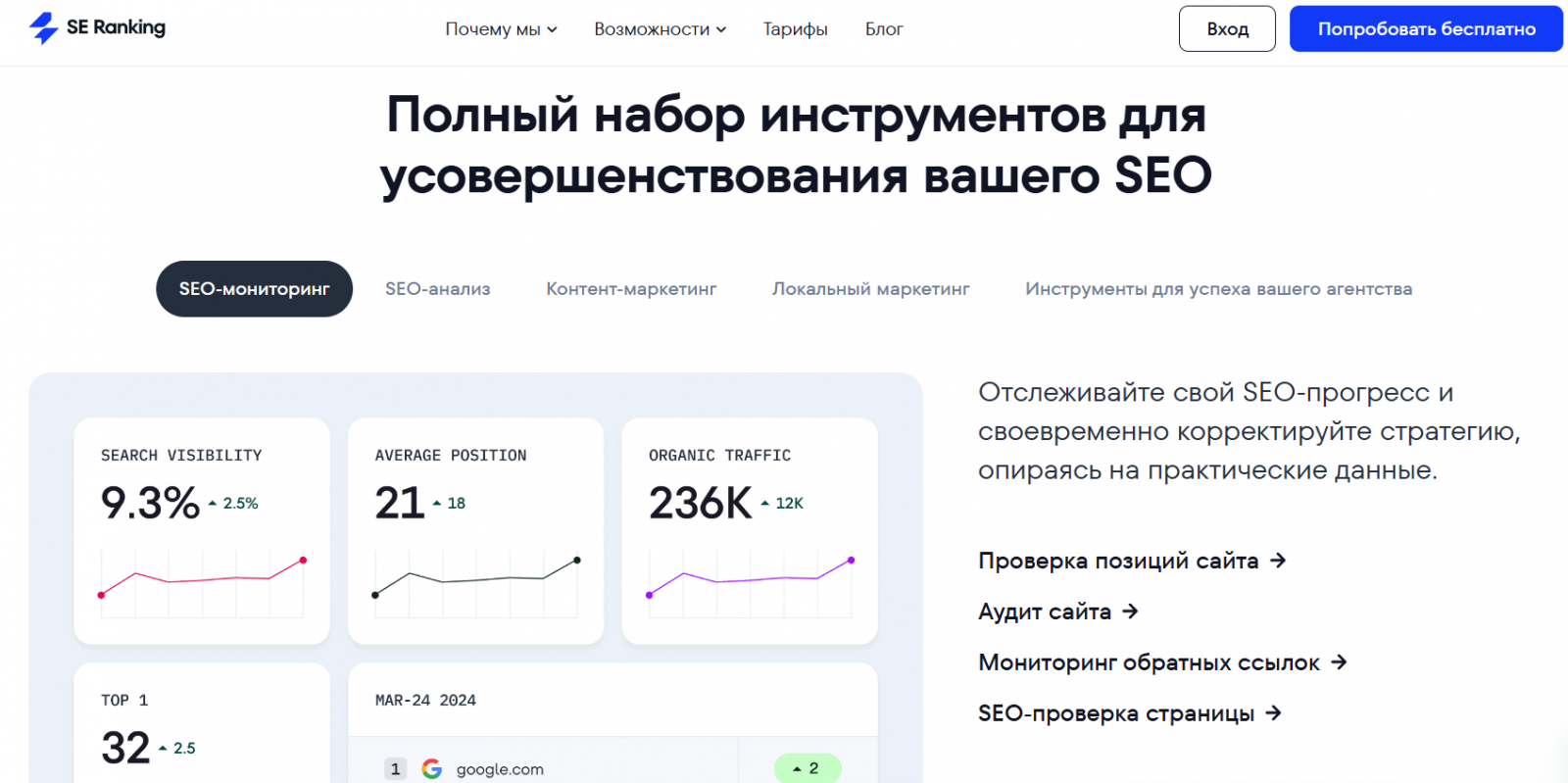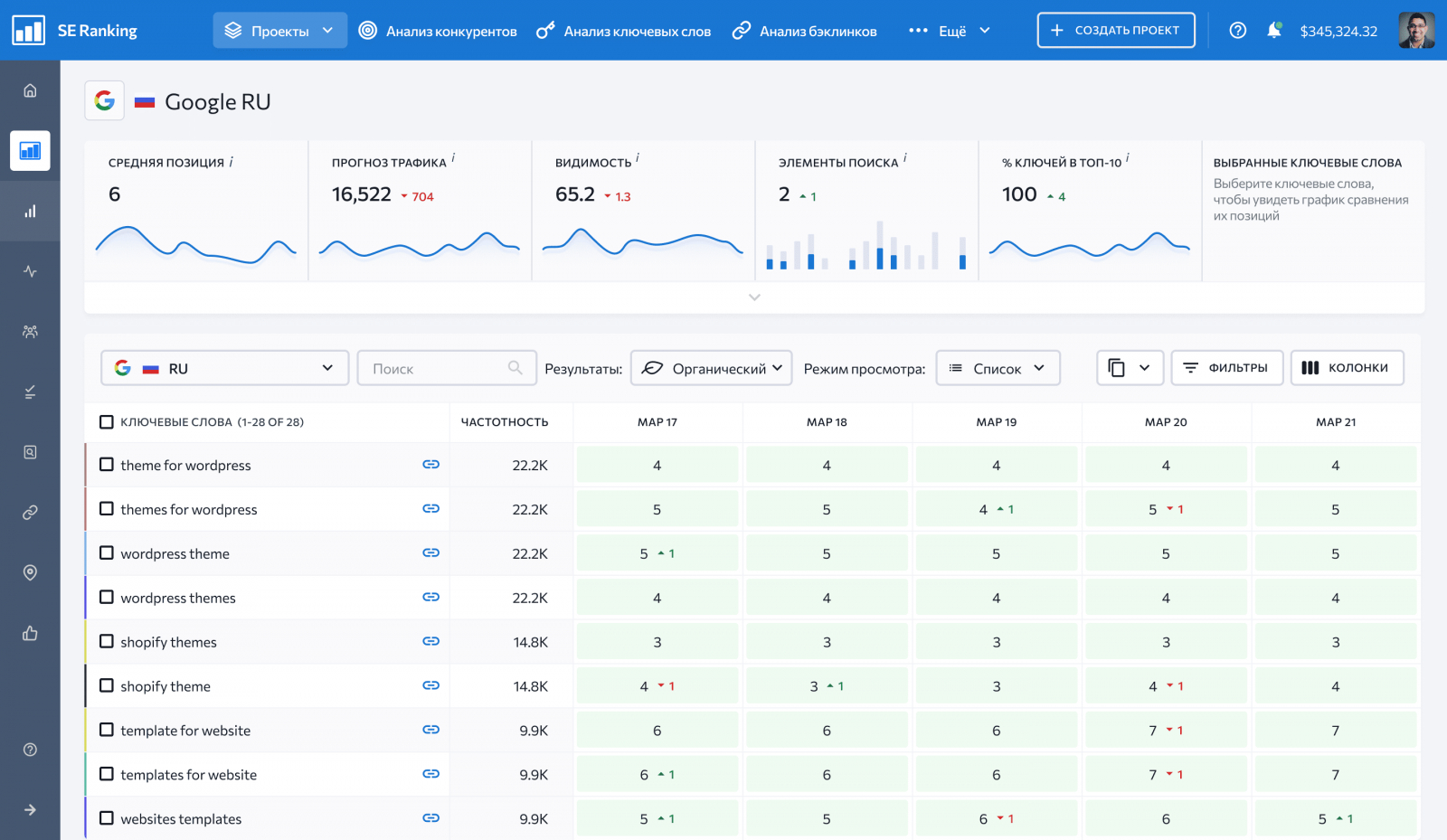 SE Ranking помогает отслеживать позицию сайта в поисковых системах и понимать, насколько эффективно работает ваша SEO-стратегия. Он собирает данные по выбранным ключевым словам и показывает динамику изменений.