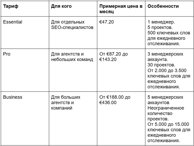 Цены ориентировочные, так как на итоговую стоимость влияет количество ключевых слов, проектов и частота проверок. Стоимость указана при годовой подписке.