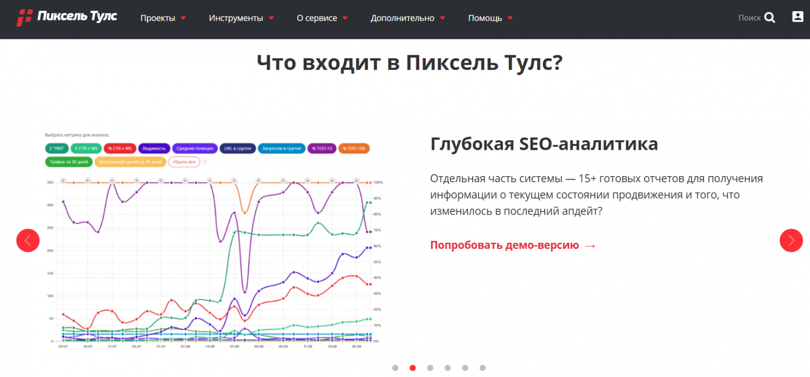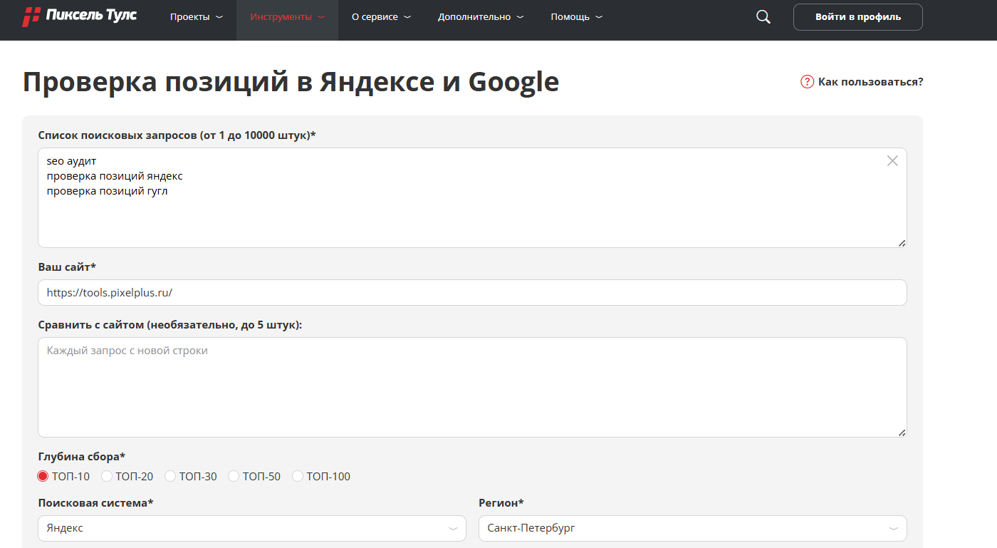 Пиксель Тулс помогает следить за тем, как ваш сайт продвигается в поиске, и оценивать, насколько эффективно работает SEO. Он собирает данные о позициях по разным ключевым словам и учитывает результаты как для мобильных устройств, так и для компьютеров.