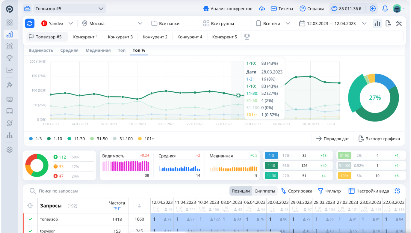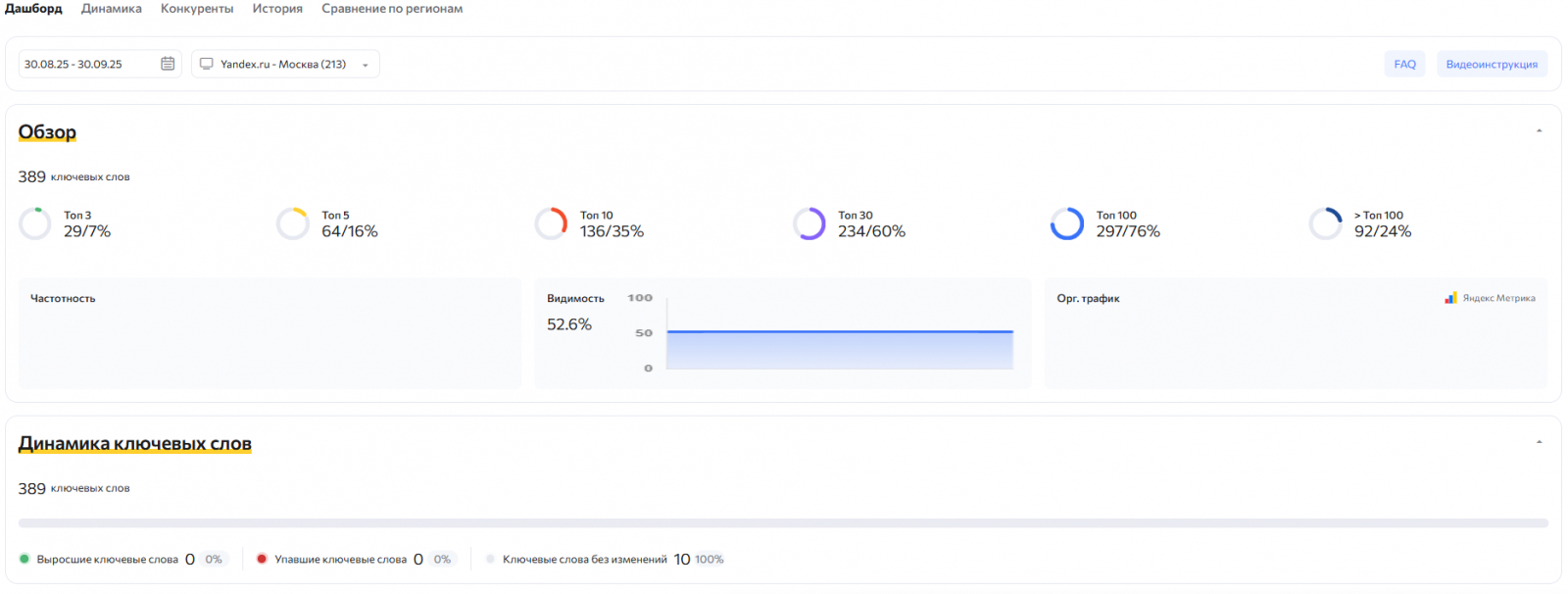 - Глубокая аналитика по конкурентам: сравнение выдачи, динамика, видимость.