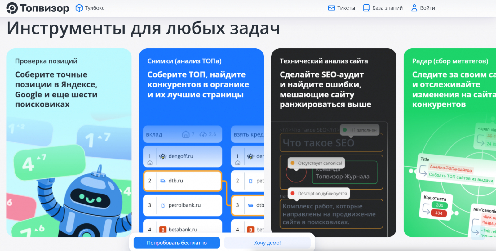 - Дополнительные инструменты (анализ ТОПов, запросов, ссылок) в одном сервисе.