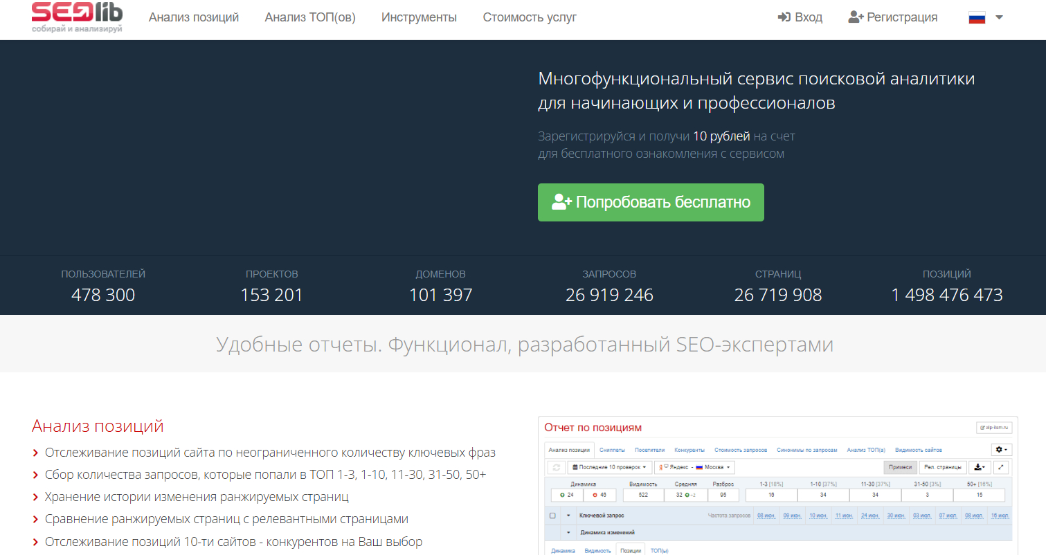 SEOlib позволяет отслеживать позиции сайта по любому количеству ключевых фраз, анализировать выдачу, сравнивать себя с конкурентами и получать детальные отчеты. Инструмент подходит как для новичков, так и для профессиональных SEO‑специалистов.