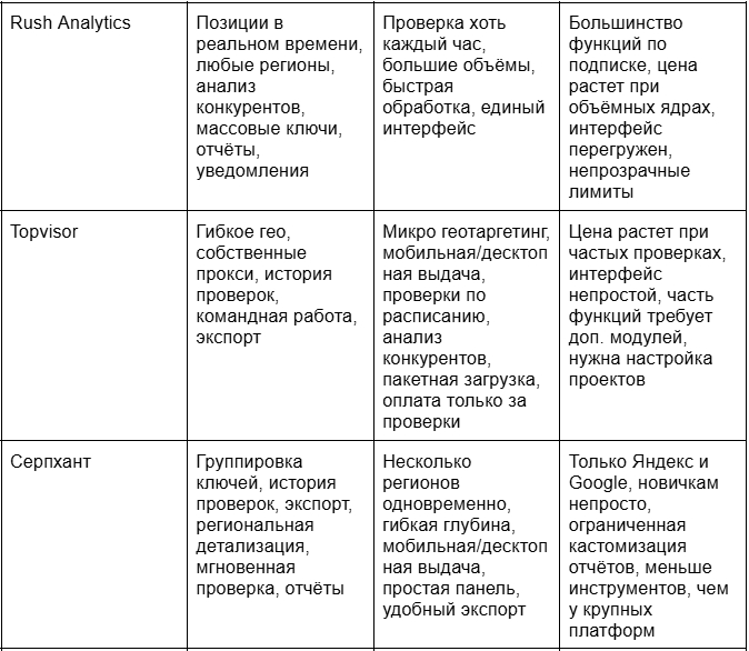 - Совмещение проверки позиций с рекомендациями по оптимизации.