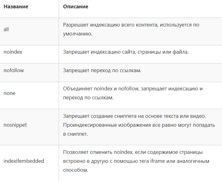 Для поисковых роботов Яндекс доступна только часть этих параметров, которые российский поисковик называет «директивами»: all, noindex, nofollow и none. Также можно запретить показывать ссылку на страницу в сохраненных результатах поиска с помощью параметра noarchive.