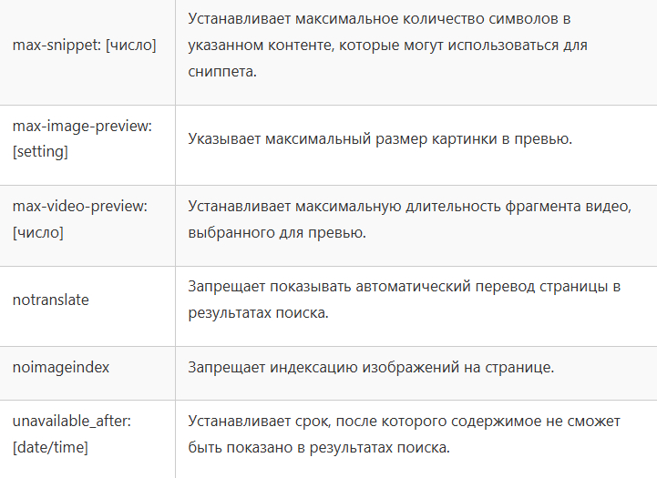 Вот спецификации тега robots, которые можно добавить в код для того, чтобы прописать инструкции поисковым роботам Google.