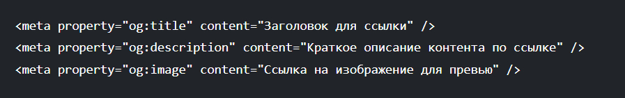 Метатег Open Graph позволяет настроить то, как ссылка на страницу будет выглядеть в соцсетях и мессенджерах. Когда пользователь делится материалом или товаром в каталоге, формируется сниппет, похожий на то, что мы видим в поиске. В него входят заголовок, описание и картинка.