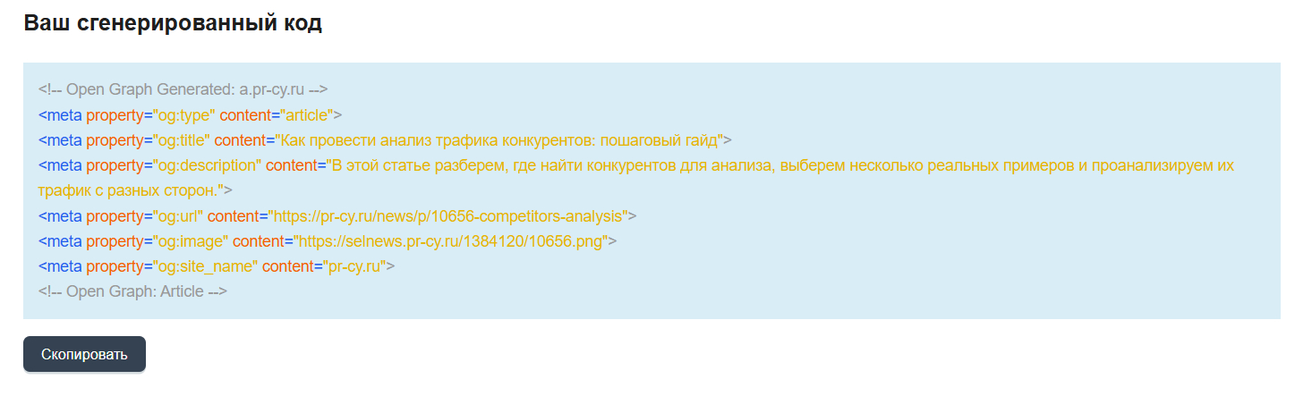 Чтобы быстро написать метатеги Open Graph, можно использовать онлайн-генератор. Заполните все необходимые поля, и сервис автоматически выдаст результат.