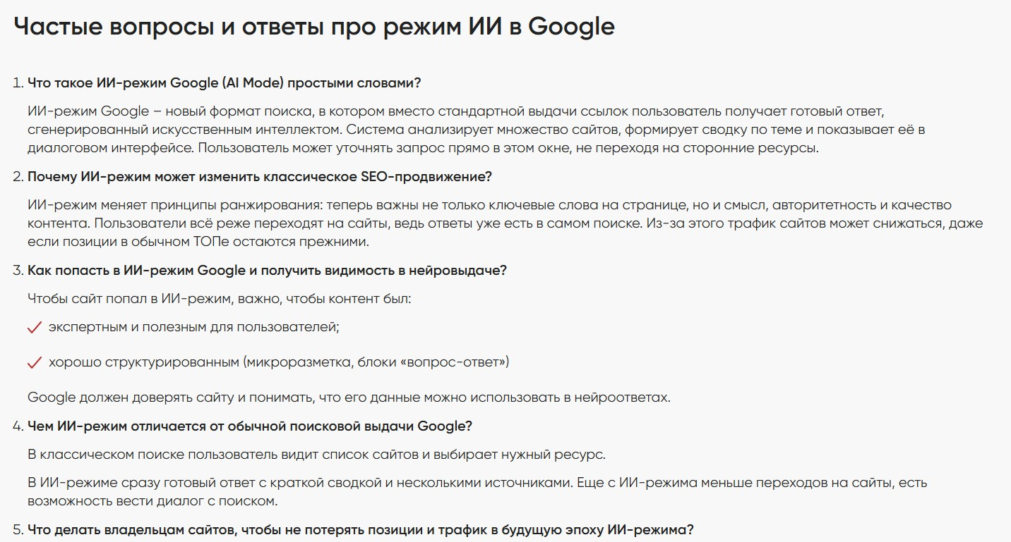 Дело здесь не только в том, что всеми силами надо попасть в нейровыдачу, хотя блок FAQ — отличный способ, чтобы это сделать. В последнее время частые вопросы нередко можно увидеть и в экспертных статьях — текстах, в которых детально разбирают какую-то тему и отвечают на вопросы читателя. Например, вот здесь в статье про ИИ-режим от Гугл есть тот самый FAQ.