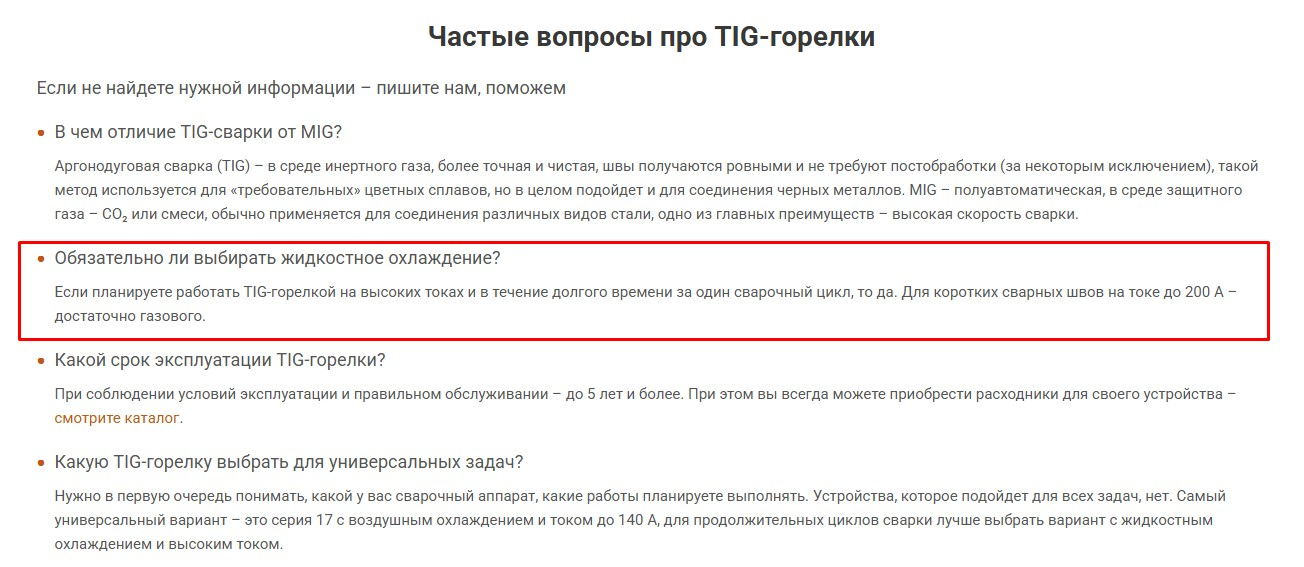Хорошо написанный и структурированный FAQ поможет быстро найти то, что нужно. Например, пользователю надо узнать конкретную информацию о горелках для аргонодуговой сварки, а в огромной статье рыться не очень хочется – тогда как раз и пригодится FAQ. Или, допустим, требуется узнать, какой тип охлаждения устройства подойдет для определенных задач — а в блоке часто задаваемых вопросов как раз есть ответ: