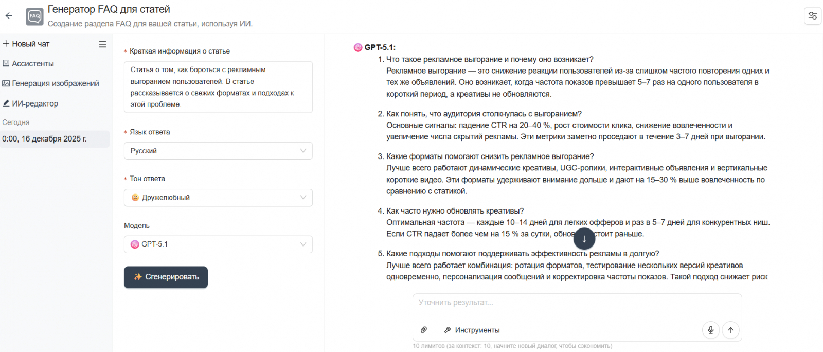 Чтобы сэкономить время, можно использовать генератор FAQ, основанный на ИИ. Он буквально за секунды превращает короткое описание вашей статьи в продуманный набор вопросов и ответов. Система изучает материал, улавливает ключевые моменты и создает логичные FAQ‑блоки, которые помогают улучшить восприятие контента и делают его полезнее для поисковых систем.