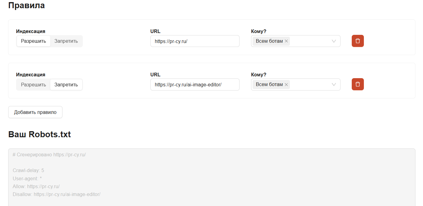 Не всегда robots.txt нужно создавать самостоятельно. Многие конструкторы сайтов формируют его автоматически, а от вас требуется только наполнить его содержимым. Еще чтобы написать robots.txt, можно воспользоваться онлайн-инструментом: генератор создаст файл за пару минут.