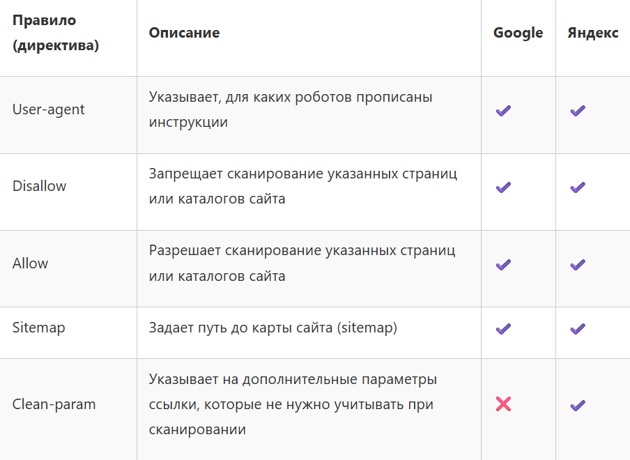 Внутри самого файла располагаются правила (так их называет Google) или директивы (такое слово использует Яндекс), которые считывают поисковые роботы. С их помощью можно установить разрешение или запрет на сканирование страниц для всех или отдельных роботов, а также указать некоторые другие параметры. Обратите внимание — Яндекс поддерживает на одну директиву больше, чем Google.