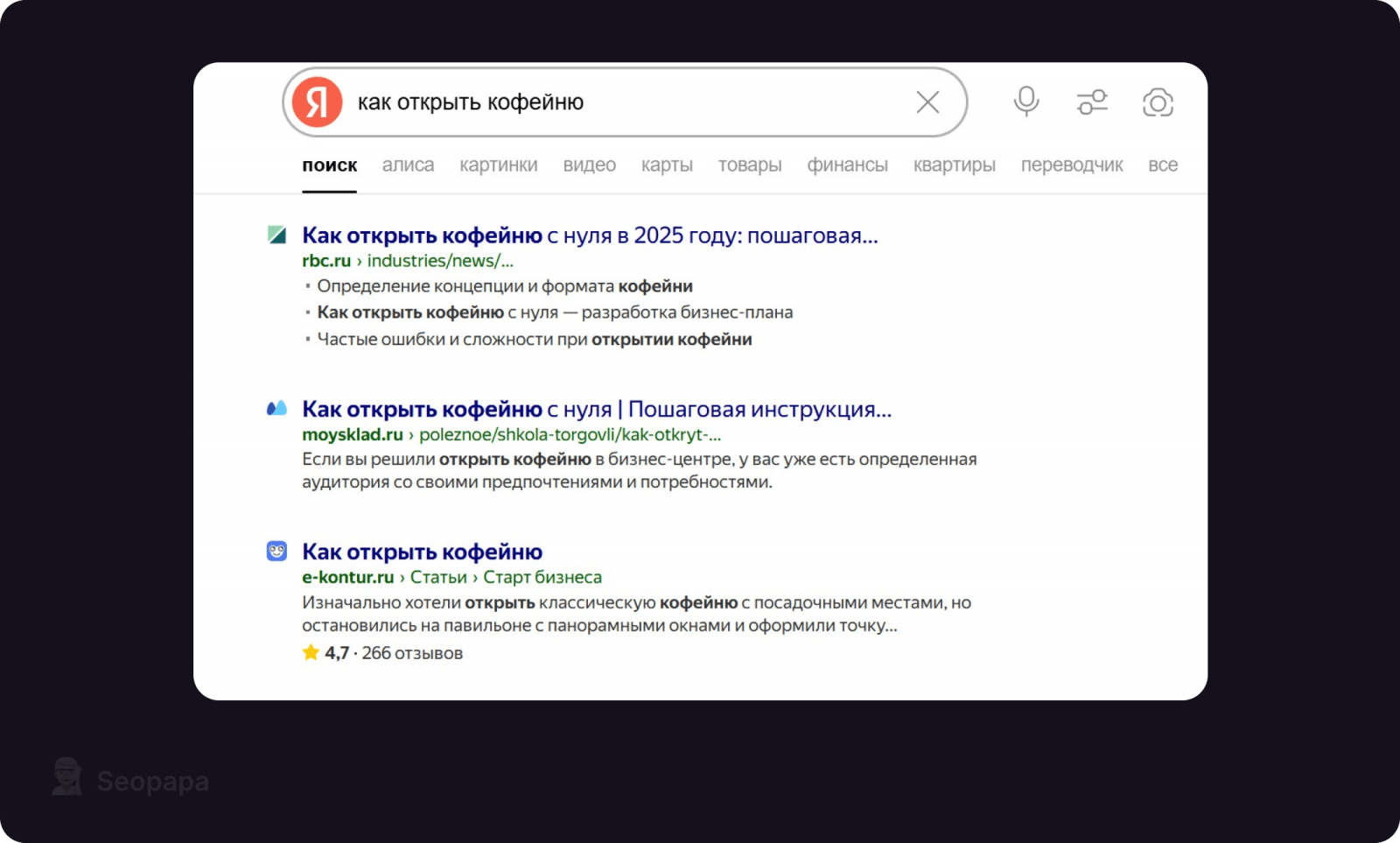 Когда человек вводит запрос вроде «как открыть кофейню», он видит список сайтов на первой странице. Как правило, ему достаточно открыть один-два результата, чтобы получить нужную информацию. Исследование Backlinko показывает: менее 1% пользователей добираются до второй страницы выдачи. То есть почти весь трафик остаётся в топ-10.