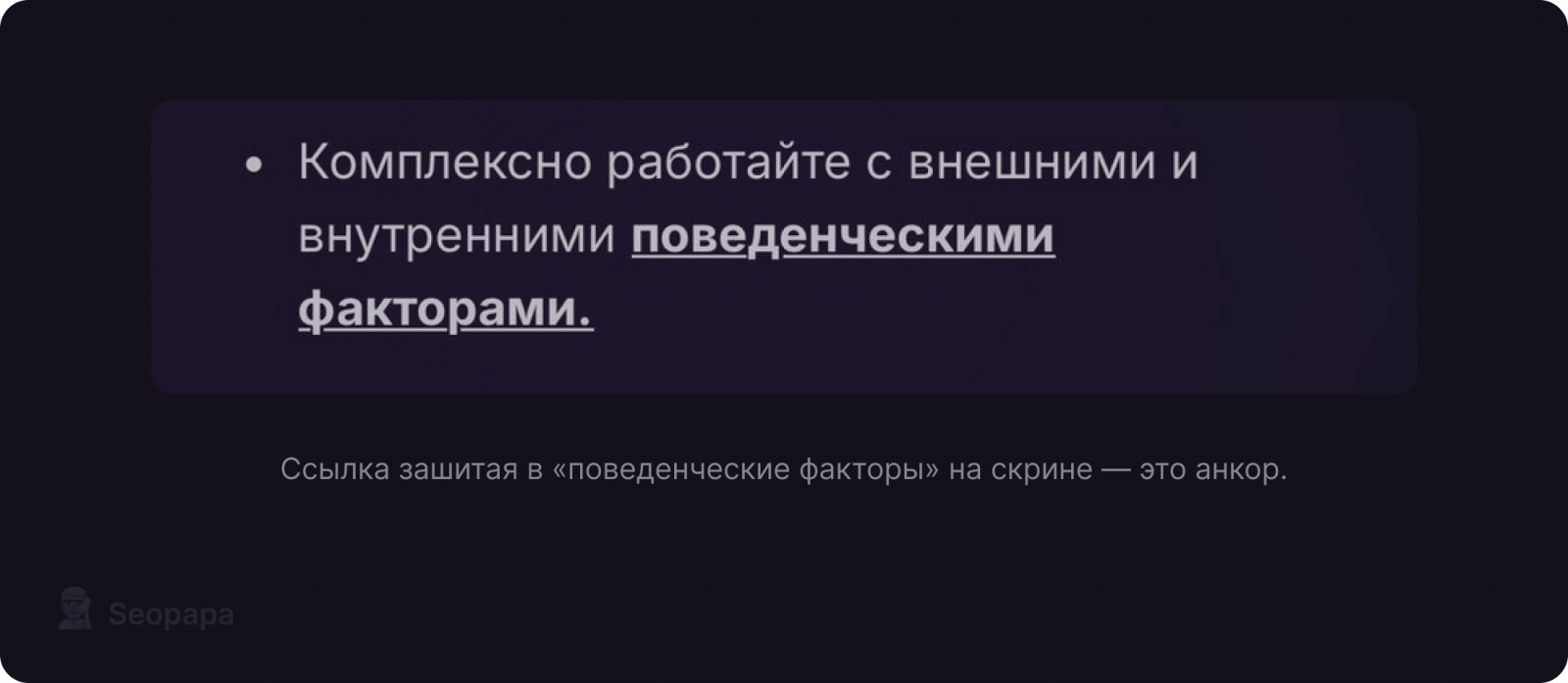 Фраза, в которую встроена ссылка, называется анкором. Например, если ссылка скрыта в словах «поведенческие факторы», то именно эта фраза и будет анкорным текстом.