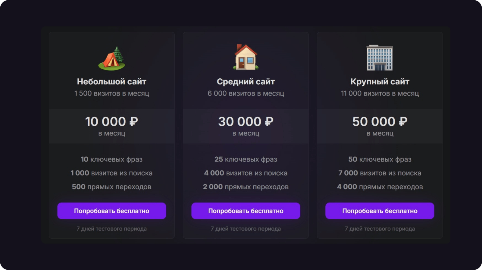 Отдельный вопрос — стоимость услуги SEO-продвижения. Часть решений скрывает реальные цены за формой «оставьте заявку, и менеджер свяжется». Другие дают бесплатный пробный период на 7–14 дней, где можно проверить все функции до оплаты. В обзоре приоритет у тех, кто показывает тарифы на сайте.