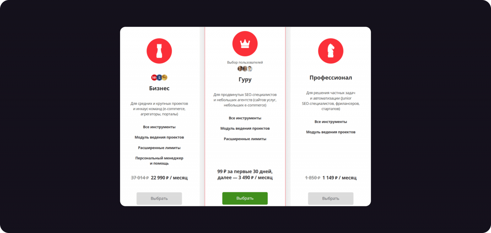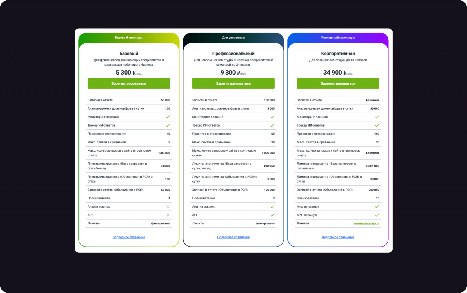 Если владелец интернет-магазина на 500 товаров хочет вывести карточки в топ-10 поисковой выдачи, ему нужен технический аудит страниц сайта, кластеризация ключевых слов по категориям и отслеживание позиций в Яндекс и Google. А автору с контентной оптимизацией для SEO продвижения достаточно подбора релевантных запросов и анализа конкурентов в своей нише. Разный масштаб бизнеса — разные требования к функционалу.