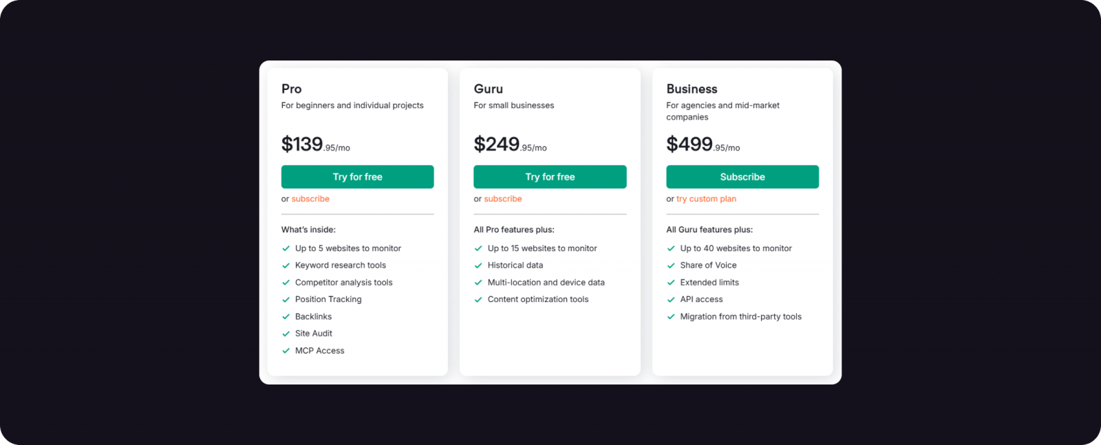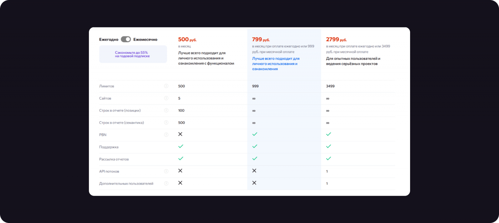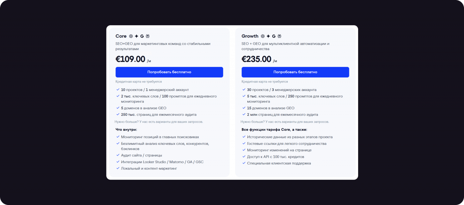Кому подходит: маркетинговым командам, владельцам бизнеса и фрилансерам, которым нужен полный набор SEO-инструментов — в базовый тариф входит 1 менеджерский аккаунт и 10 проектов, на тарифе Growth — 3 аккаунта и 30 проектов. Можно платить за год и за месяц.