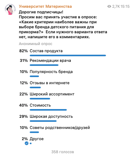 - Качество продукта остается главным критерием выбора. Родители обращают внимание на состав питания, наличие натуральных ингредиентов и отсутствие нежелательных добавок.