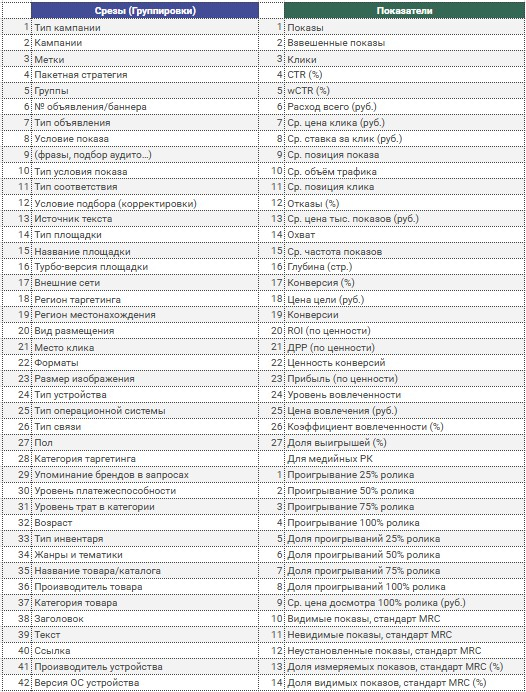 Давайте еще взглянем на инструментарий Директа для анализа показателей рекламных кампаний. Мы рассмотрим лишь часть. То, что является штатным функционалом для анализа в Яндекс Директ. Итак, для анализа кампаний встроенный функционал “Мастер отчетов Яндекс Директ” на сегодня предлагает следующие группировки и показатели: