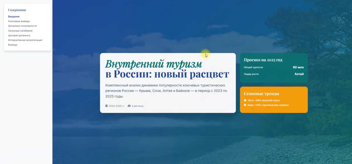 Сайт с интерактивным дашбордом: можно выбрать год, сезон и регион, посмотреть динамику турпотока, сравнить цены и увидеть ключевые тренды в режиме реального времени. Все выглядит наглядно и удобно для быстрой работы с данными.