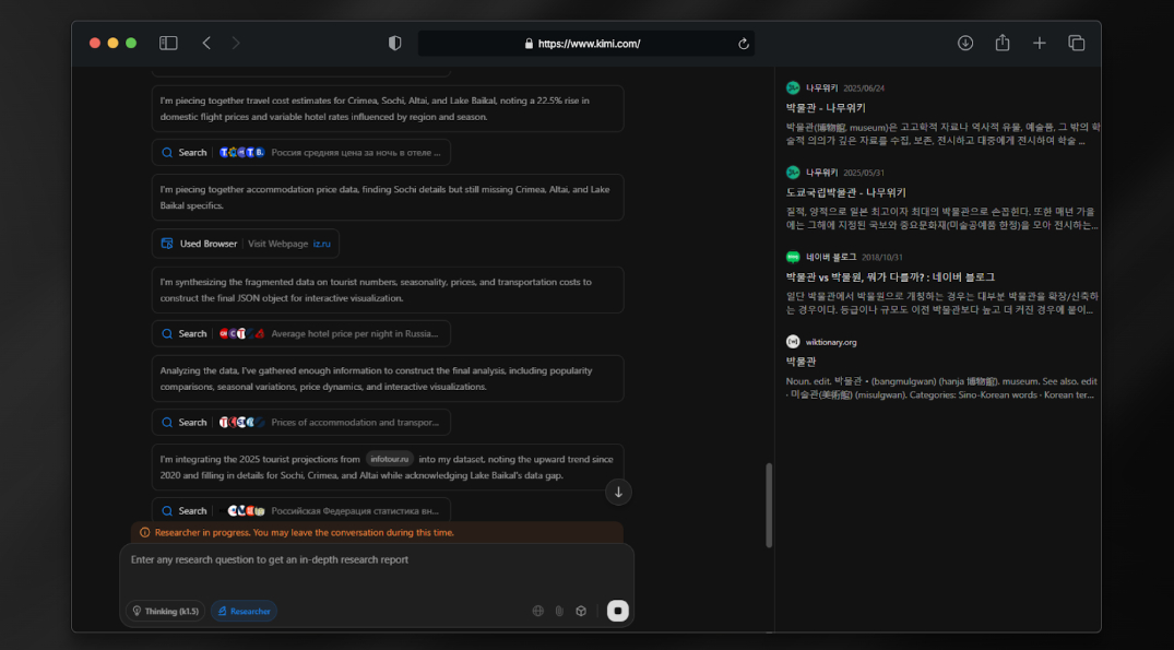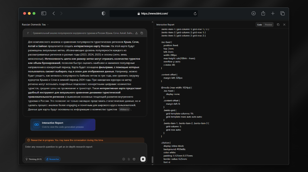 Ситуация изменилась, когда я заметил новый режим «Researcher». Разработчики Moonshot AI позиционируют его как инструмент для глубокого исследования, который не просто выдает подборку ссылок, а создает структурированный материал с графиками, таблицами и выводами — в виде интерактивной веб-страницы. Такой результат можно сразу использовать для работы: он подходит для презентаций и аналитических записок.